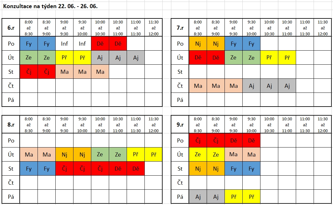 Na vybrané konzultace je třeba se závazně přihlásit, vždy na celý týden najednou, a to nejpozději ve čtvrtek předchozího týdne. Tedy na týden 22. – 26. 6. nejpozději ve čtvrtek 18. 6.