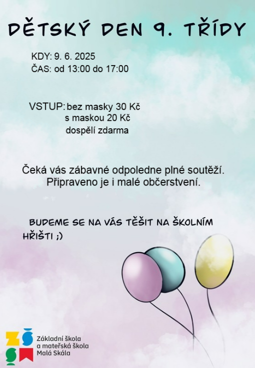 Přijďte si užít pěkné odpoledne se svými dětmi v pondělí 9. června. O zábavu se vám postarají žáci 9.A.
